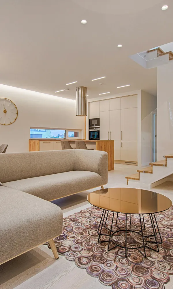 The sofa features a solid oak frame, offering strength, warmth, and timeless appeal. Upholstered in a light, soft-touch fabric, the seating is not only comfortable and cozy, but also highly resistant to wear and easy to maintain — ideal for active family life.